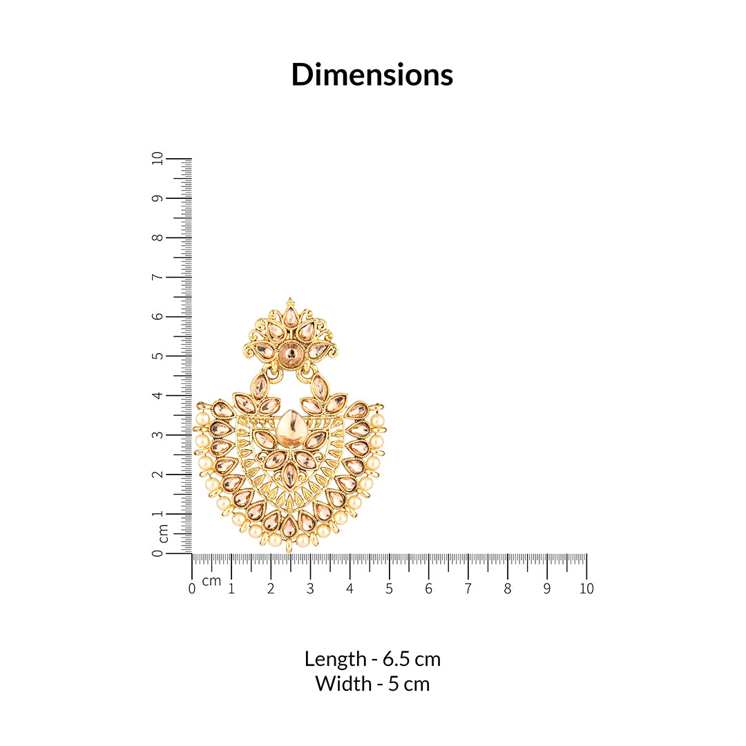Command attention with these truly majestic antique gold oxidized chandbali earrings, featuring a grand and ornate peacock-inspired design. The large, intricate shape is richly embellished with sparkling champagne-colored stones, intricately set to create a dazzling effect. A lush fringe of lustrous peach-colored pearls gracefully dangles from the bottom, adding an opulent touch and charming movement. These substantial and exquisitely detailed earrings are perfect for weddings, grand festive occasions, or to elevate your traditional Indian attire with a truly regal and luxurious presence.