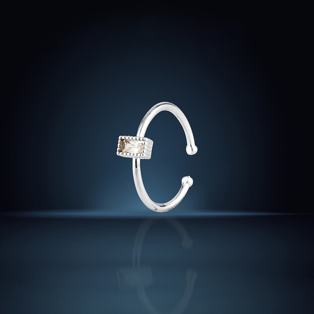 This delicate sterling silver ring features an open, adjustable band, offering a comfortable and versatile fit for various finger sizes. At its focal point is a sparkling baguette-cut cubic zirconia stone, elegantly set horizontally within a clean, bezel setting. The minimalist and modern aesthetic, highlighted by the elongated stone, makes this ring perfect for stacking with other rings or wearing alone for a touch of understated brilliance. Crafted from high-quality sterling silver, it provides a lasting shine and is suitable for everyday wear.