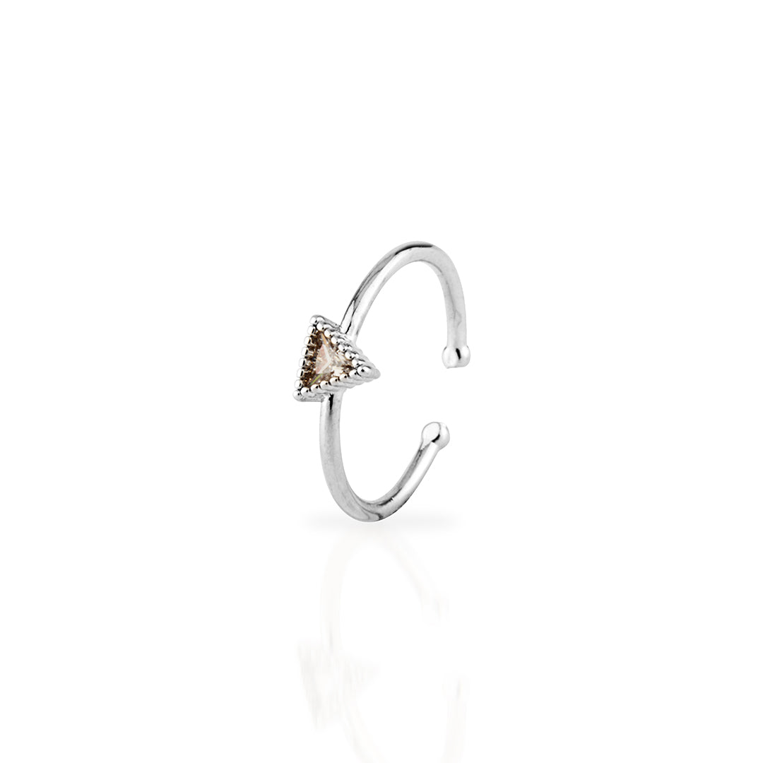 This delicate sterling silver ring features an open, adjustable band, offering a comfortable and versatile fit for various finger sizes. At its focal point is a sparkling cubic zirconia stone, elegantly set within a distinct triangular-shaped bezel, subtly accented with a beaded edge. The minimalist and modern aesthetic, highlighted by the geometric stone, makes this ring perfect for stacking with other rings or wearing alone for a touch of contemporary brilliance. Crafted from high-quality sterling silver, it provides a lasting shine and is suitable for everyday wear.
