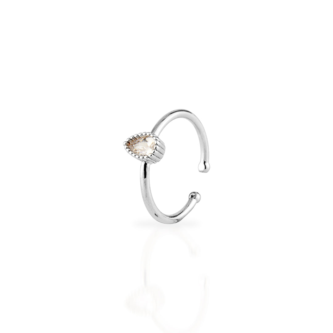 This delicate sterling silver ring features an open, adjustable band, offering a comfortable and versatile fit for various finger sizes. At its focal point is a sparkling pear-cut (teardrop-shaped) cubic zirconia stone, elegantly set within a subtle bezel. The graceful and minimalist aesthetic, highlighted by the unique stone shape, makes this ring perfect for stacking with other rings or wearing alone for a touch of understated elegance. Crafted from high-quality sterling silver, it provides a lasting shine and is suitable for everyday wear.