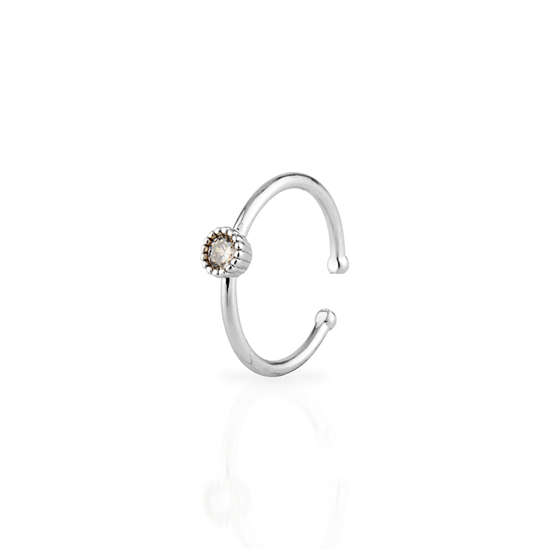 This delicate sterling silver ring features an open, adjustable band, offering a comfortable and versatile fit for various finger sizes. At its focal point is a sparkling round cubic zirconia stone, elegantly set within a distinctive textured or ridged bezel, reminiscent of a gear or a radiating sun. The minimalist yet detailed aesthetic, highlighted by the unique setting, makes this ring perfect for stacking with other rings or wearing alone for a touch of subtle brilliance and character. Crafted from high-quality sterling silver, it provides a lasting shine and is suitable for everyday wear.