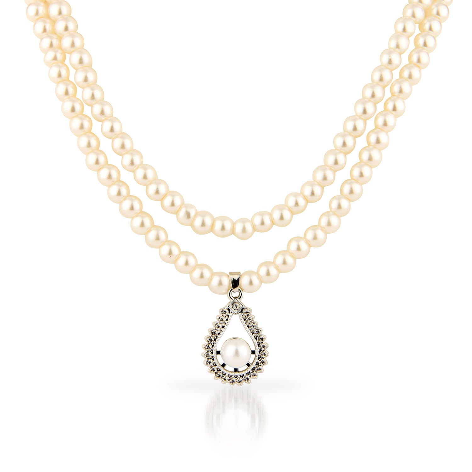 Showcase exquisite luxury with our Double Strand Faux Pearl Necklace Set. This sophisticated artificial jewelry features two continuous layers of luminous, uniform imitation pearls, offering a timeless, cascading effect. The focal point is a beautiful teardrop pendant, meticulously framed in dazzling American Diamond (AD) pave crystals, cradling a single suspended pearl within. The set is completed with elegant, matching teardrop/pear-shaped pearl drop earrings, each topped with a solitaire crystal. The necklace is secured with a dependable lobster clasp. Ideal for bridal jewelry, black-tie events, or whenever you desire a look of polished, high-end glamour.