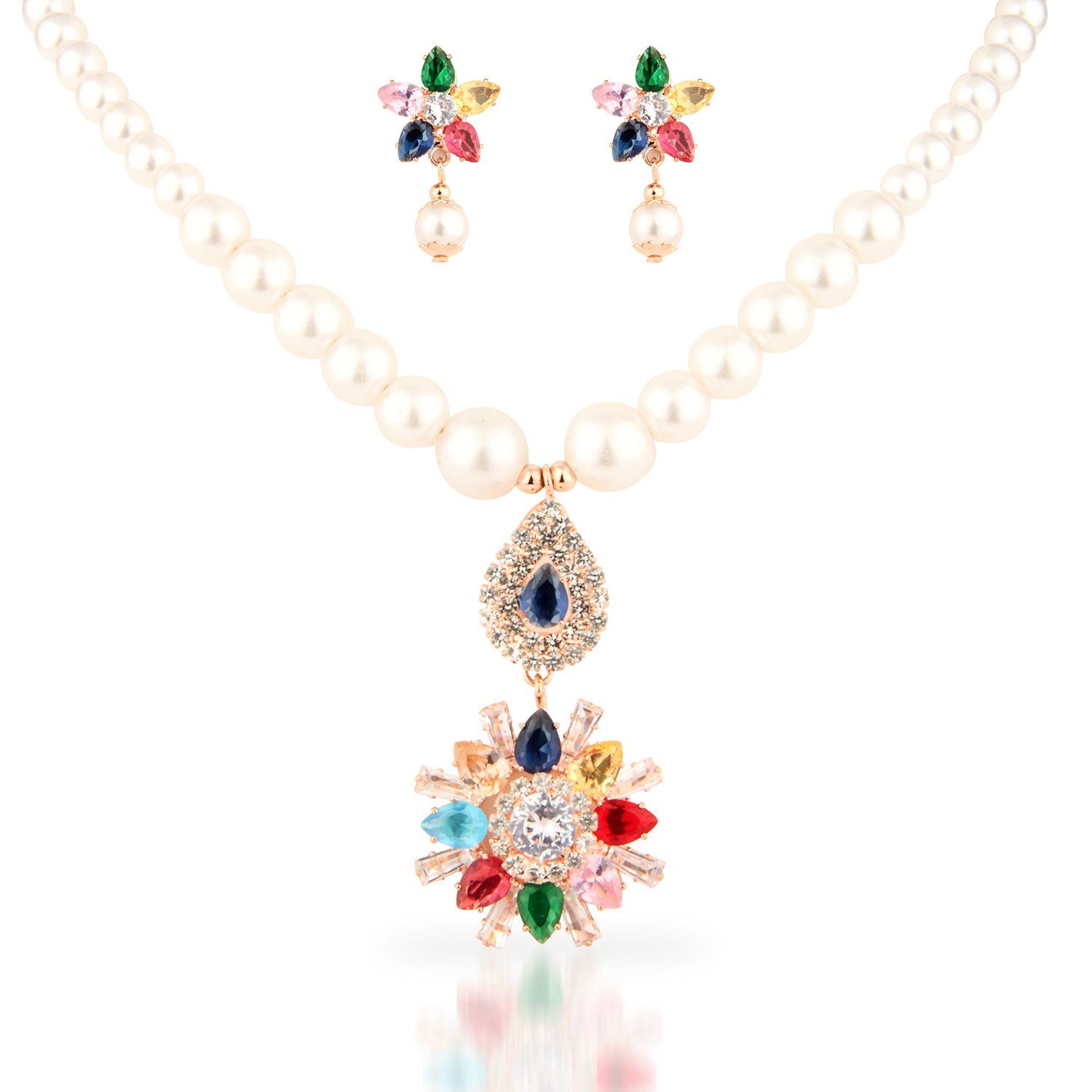 Add a vibrant pop of color to your wardrobe with our Multi-Color Crystal Floral Faux Pearl Set. This lively artificial jewelry features a classic single strand of luminous imitation pearls, beautifully offset by warm rose gold-tone spacers. The spectacular, cascading pendant showcases a large floral motif set with dazzling multi-colored American Diamonds (AD), including shades of ruby, emerald, sapphire, and citrine. The set is completed by matching floral drop earrings featuring miniature pearl dangles. Secured with a traditional and reliable S-hook clasp, this unique set is perfect for celebrations, cultural events, holiday parties, or as a fun, maximalist statement piece.