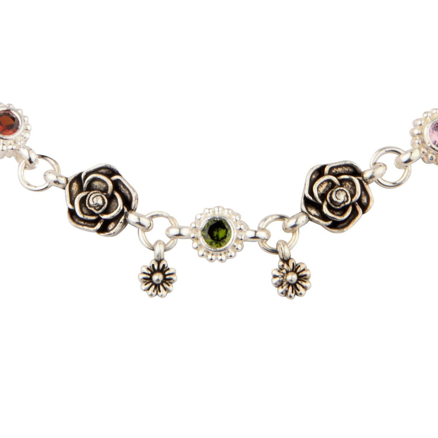 This exquisite anklet is a perfect addition to any woman's artificial jewelry collection. Inspired by nature, the design features delicate rose motif links interspersed with sparkling, multi-color gemstone accents (like red, green, and pink). Crafted for comfort and style, this anklet, also known as a payal, boasts a sturdy chain and a secure clasp with an attached little bell charm for a subtle, traditional sound. Ideal for daily wear, parties, or gifting, this artificial anklet offers the luxurious look of sterling silver and precious stones at an affordable price. Elevate your ethnic or casual look with this beautifully detailed fashion accessory.
