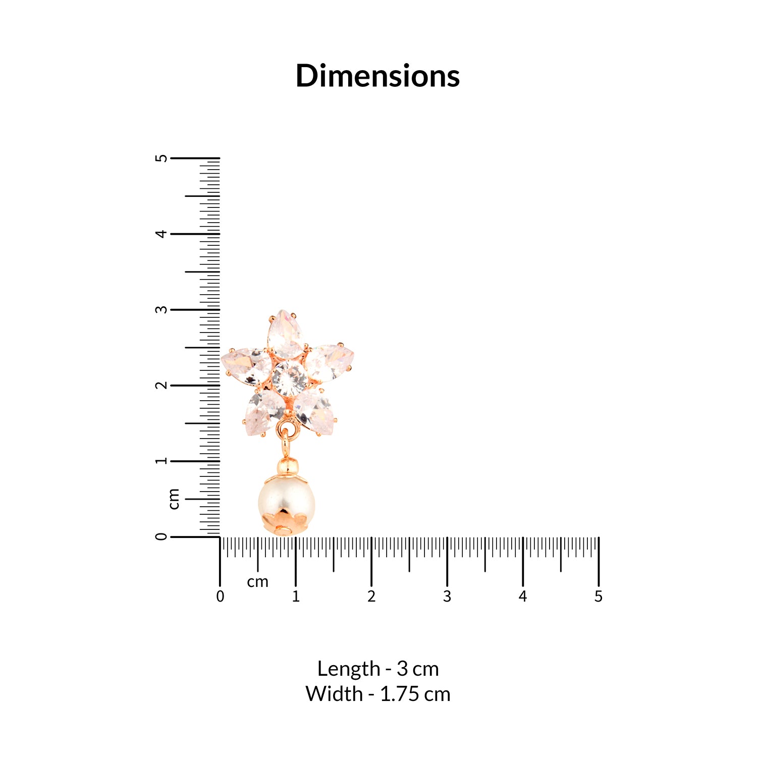 Dazzle with our luxurious Rose Gold Plated Faux Pearl Set. This statement artificial jewelry features a classic single-strand necklace of lustrous creamy imitation pearls accented by rose gold-tone beads. The spectacular pendant boasts a large floral-inspired design set with radiant pink/champagne American Diamonds (AD), suspended from a smaller crystal-pave teardrop. The matching drop earrings feature a lovely floral stud design with a hanging mini pearl. The necklace is secured with a traditional and sturdy S-hook clasp. Perfect for engagement parties, evening receptions, or as a spectacular anniversary gift.