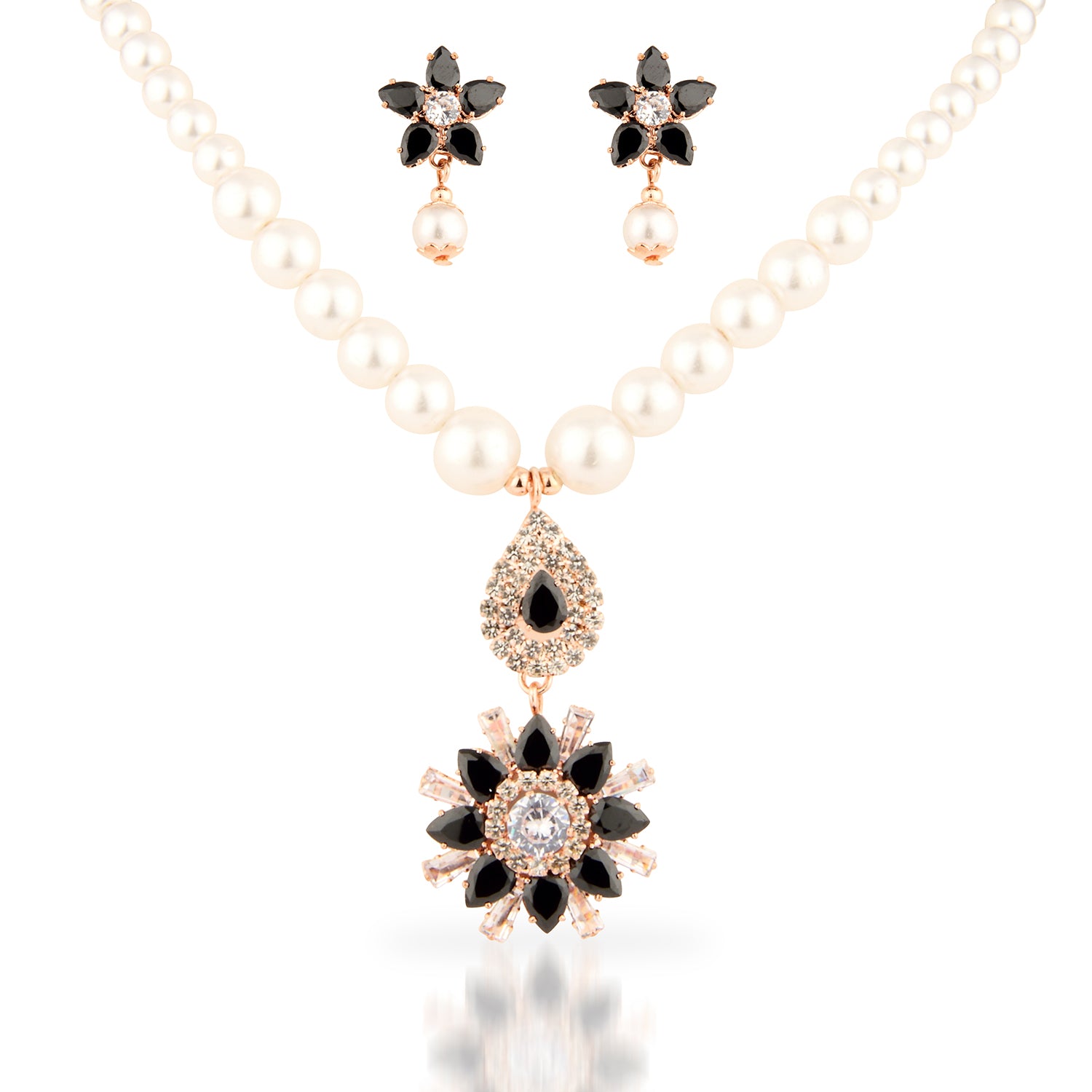 Rose Gold Faux Pearl Set with Black Crystal Floral Pendant