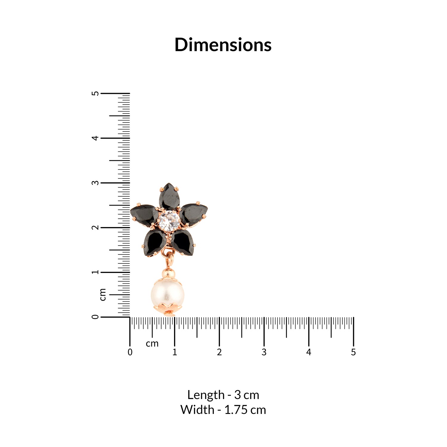 Command attention with our chic Black and Rose Gold Faux Pearl Set. This statement artificial jewelry features a classic strand of luminous imitation pearls set in a flattering choker length, accented by rose gold-tone spacers. The dramatic, cascading pendant showcases a large black and clear American Diamond (AD) floral design, creating a stunning contrast. The necklace is complemented by matching floral drop earrings with a hanging mini pearl. Secured with a traditional and reliable S-hook clasp, this unique set is perfect for sophisticated evening wear, galas, or as an edgy yet elegant piece for a formal event.