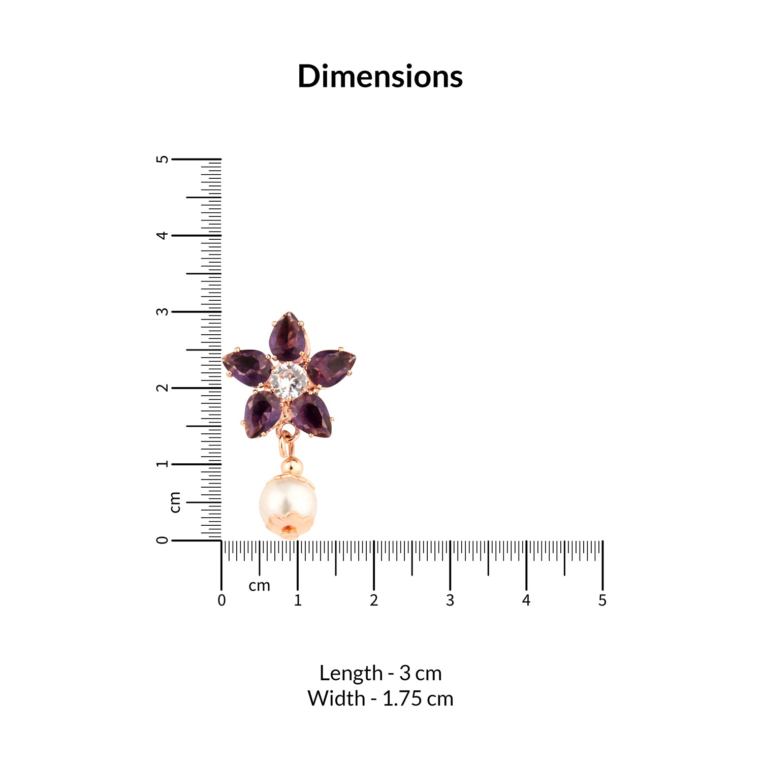 Captivate the room with our opulent Purple Crystal Floral Faux Pearl Set. This exquisite artificial jewelry features a classic single strand of high-luster imitation pearls, elegantly offset by warm rose gold-tone spacers. The spectacular, cascading pendant showcases a large floral-inspired motif set with rich amethyst-colored and clear American Diamonds (AD), creating a truly regal look. The set is perfectly complemented by matching floral drop earrings featuring a mini pearl dangle. Secured with a reliable S-hook clasp, this unique set is ideal for formal evenings, galas, birthdays, or as a luxurious, thoughtful gift.