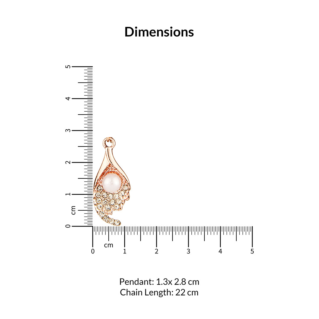 Adorn your neckline with this elegant rose gold-plated necklace, featuring a beautifully crafted wing-inspired pendant. The design showcases a luminous pearl nestled at its heart, complemented by a cascade of sparkling crystals that adorn its curved surface. The blend of the soft pearl and the brilliant crystals creates a sophisticated and eye-catching effect. Suspended from a delicate rose gold chain, this necklace is perfect for adding a touch of nature-inspired elegance or a subtle sparkle to any outfit, making it ideal for both everyday wear and special occasions.