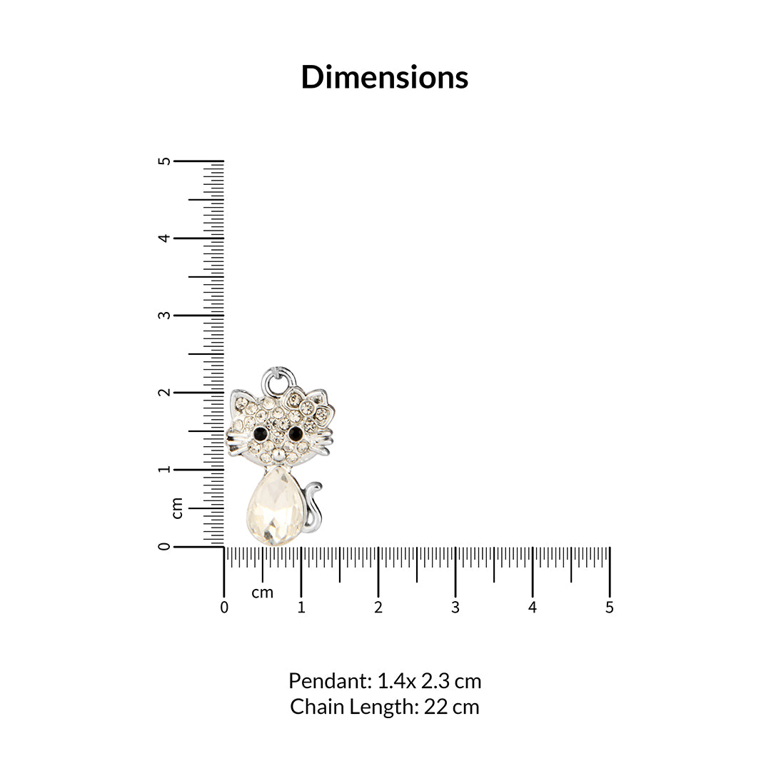 Add a touch of playful charm to your look with this adorable sterling silver cat necklace. The cat's head and body are intricately embellished with sparkling clear crystals, while its eyes feature contrasting darker stones for a captivating gaze. A sweet bow detail adorns its ear, and a large, shimmering teardrop-shaped crystal forms its lower body, adding elegant dangle and sparkle. Suspended from a delicate silver chain, this necklace is perfect for cat lovers and anyone who appreciates unique and charming jewelry. It makes a delightful gift for birthdays or any special occasion.