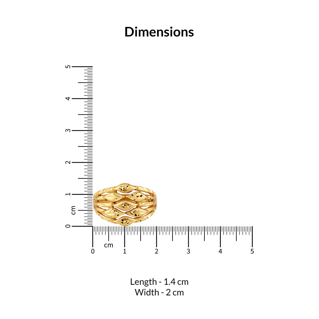 This captivating gold ring features a unique design resembling a woven pattern of textured leaves. Each leaf element is intricately detailed, creating a rich, organic feel and a subtle play of light. The overlapping design forms a stylish and substantial band, making it a distinctive piece. Perfect for those who appreciate nature-inspired jewellery with a modern twist, this ring is suitable for both everyday wear and adding an elegant touch to special occasions. Crafted from high-quality gold, it promises lasting beauty and durability.