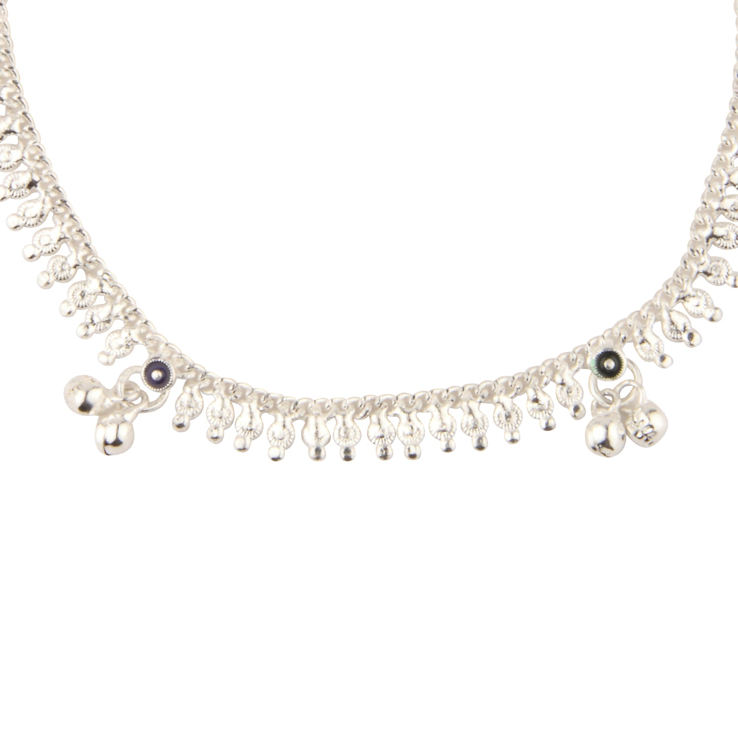 Embrace traditional elegance with this stunning artificial anklet, also widely known as a payal. The design features a delicate yet elaborate chain adorned with multiple cascading ghungroo (small decorative bells) and metallic drops, creating a classic, eye-catching look. Small, subtle accents of colored stones (like red, green, and purple) are incorporated to add a touch of sparkle and vibrance to the timeless aesthetic. This traditional payal is perfect for wedding ceremonies, festive occasions, or cultural events. It features a secure hook clasp for comfortable, all-day wear and is a beautiful, affordable accessory to complement any ethnic outfit.